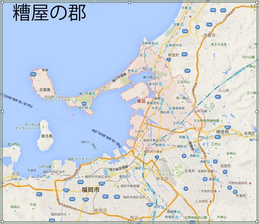 ※糟屋の郡は志珂郷(現在の志賀島)、安曇郷(新宮、和白)を中心に古賀市、立花、香椎、志免、宇美、粕屋、箱崎あたりでした。なお、おきゅうとの発祥の地の箱崎はこの地図で福岡市東区役所がある位置です。