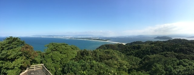 海の中道(うみのなかみち)は、志賀島と九州本土とを繋ぐ陸繋砂州で、全長約8 km。手前の森が志賀島。写真奥の左側から古賀、新宮・和白で砂州と繋がり、画面中央に香椎、箱崎あたりを望む。砂州の左側は玄界灘、右側が博多湾(古名:那の津・なのつ)・・・漢委奴国王(かんのわのなのこくおう)「なのこく」が博多湾にあった奴国=那の国のこと
