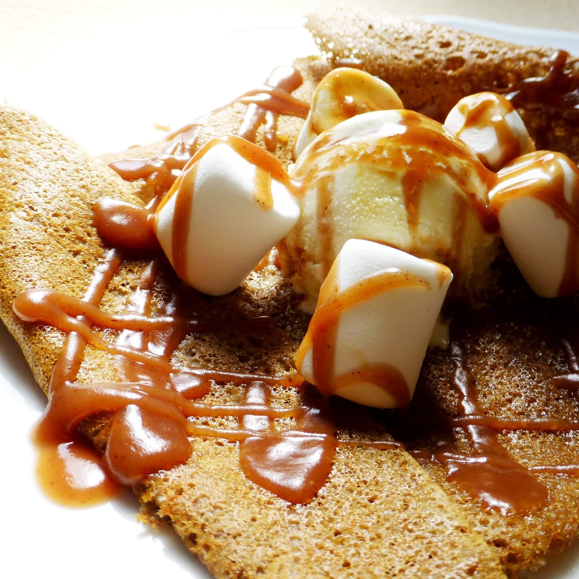 ■ 信州産そば粉(100%)を使ってカリカリに香り高く焼きあげ、地元野菜や卵にチーズやハムを乗せたお食事のガレットのほか、季節のコンポート、自家製の塩キャラメルソースや濃厚なアイスを添えたデザートガレットもご用意しております。 当店ではスイス産グリュイエールチーズ、パリ風ハム、風味豊かなカルピスバターを使用しております。