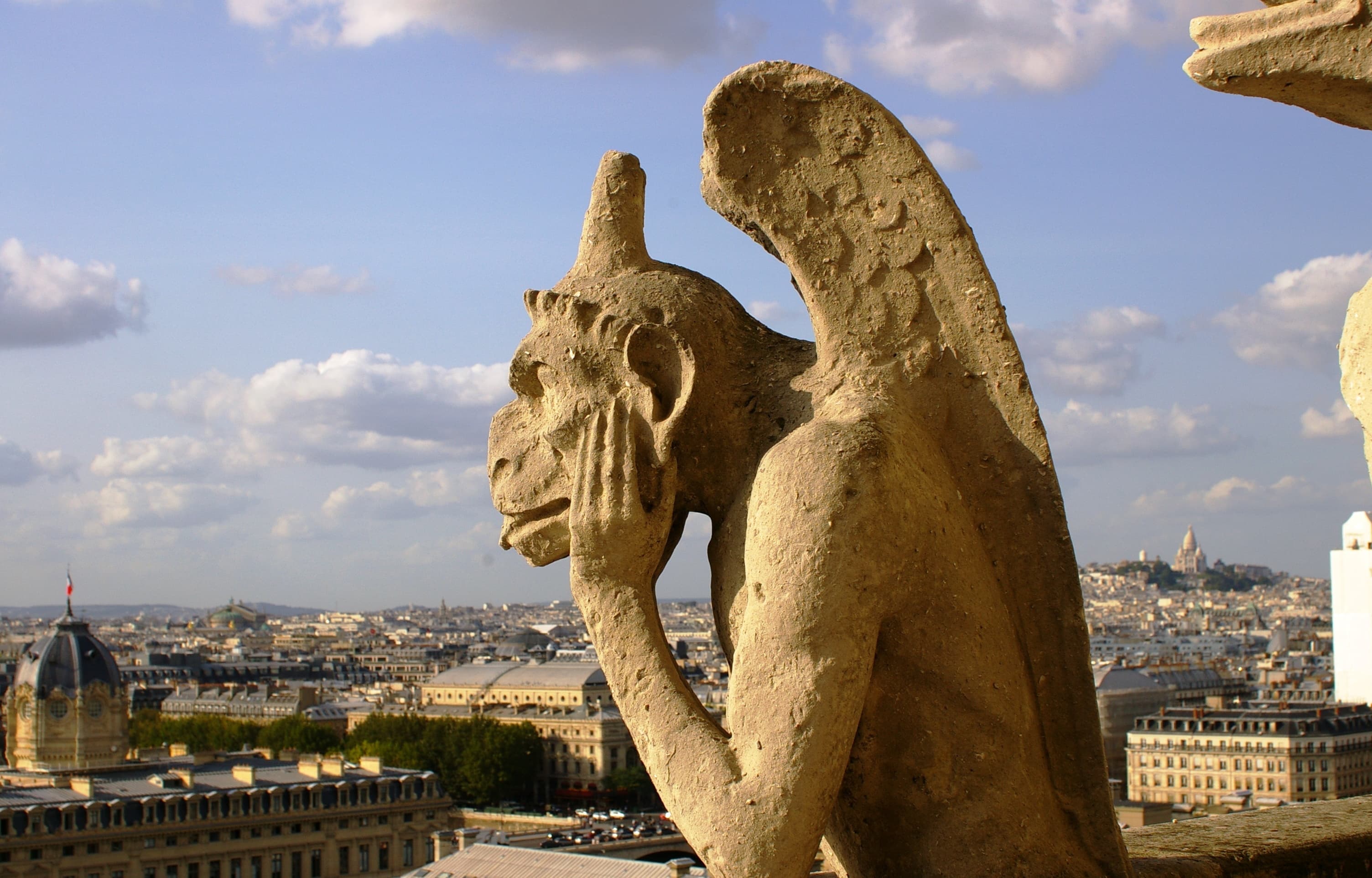 たくさんの観光客を見下ろしている化け物は階段を登らないと会えない 眼下にはセーヌ川と 遠くにエッフェル塔が見える